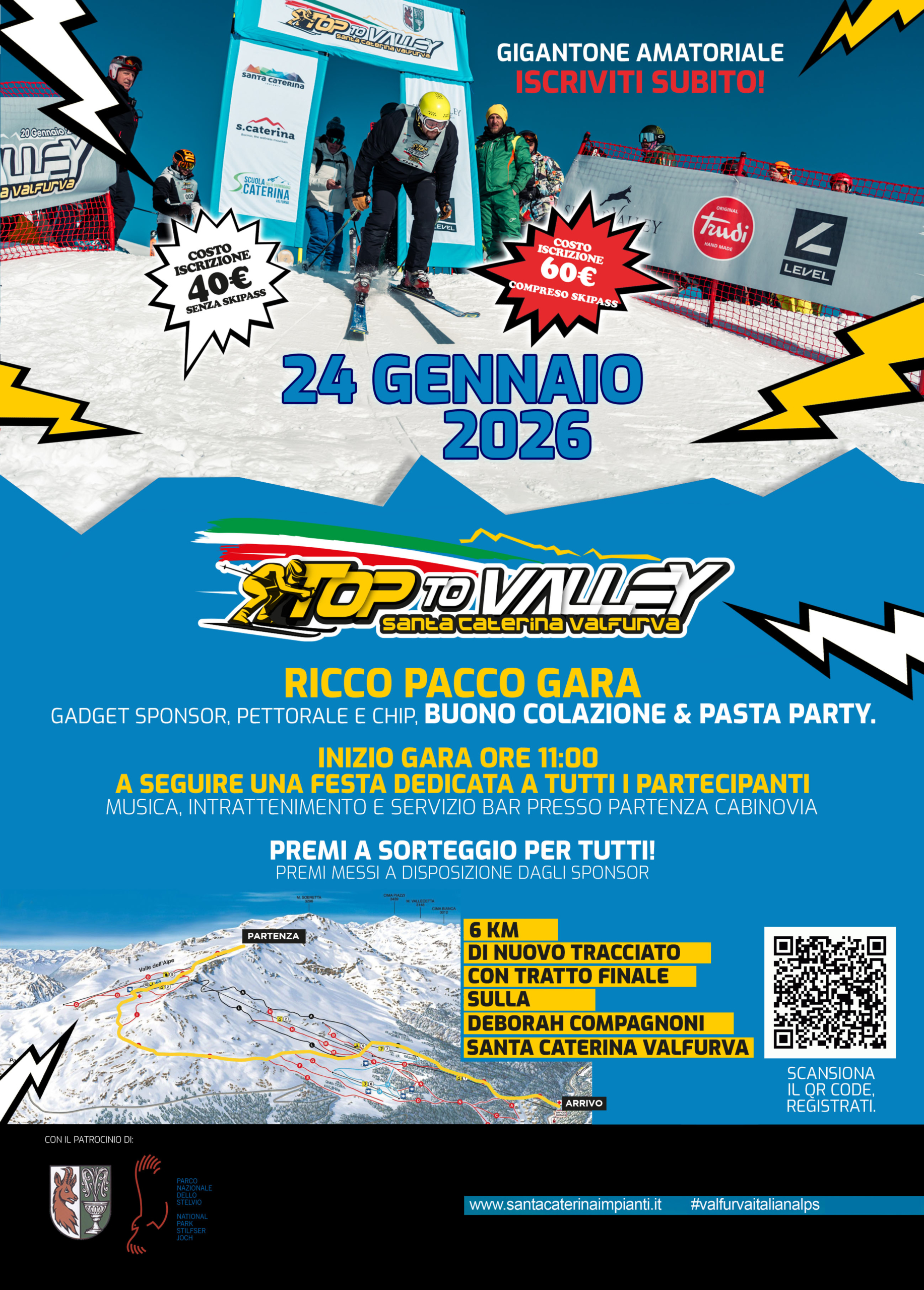 24 gennaio 2026: la gara di sci alpino amatoriale, aperta a tutti gli appassionati sci, su un nuovo tracciato ancora più divertente: 6 km di pista con tratto finale sulla mitica Deborah Compagnoni, nella cornice meravigliosa del Parco Nazionale dello Stelvio.